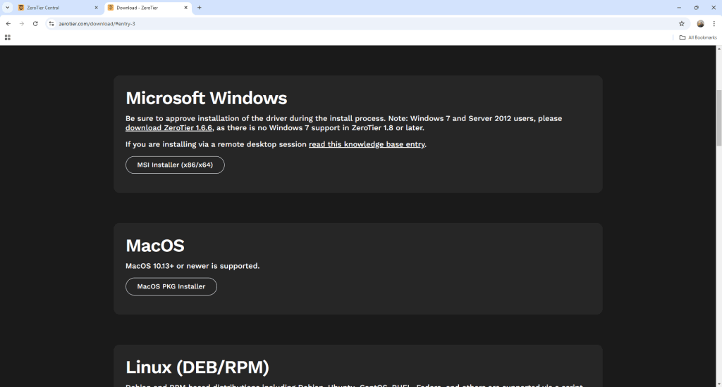 Masuk kedalam halaman https://www.zerotier.com/download/ kemudian pilih aplikasi sesuai dengan sistem operasi yang digunakan. Pada postingan kali ini menggunakan sistem operasi windows. Unduh asplikasi tersebut dan lakukan instalasi zerotier.