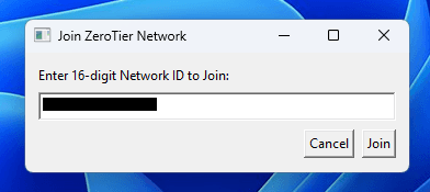 Salin Network ID yang berada pada halaman konfigurasi jaringan zerotier. Buka aplikasi zerotier melalui taskbar kemduian klik Join Network masukan Network ID yang telah disalin sebelumnya.
