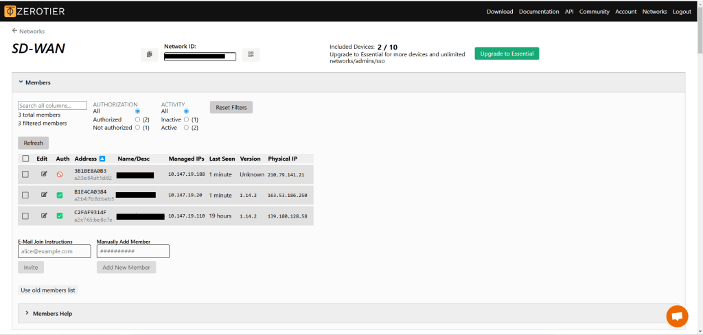 Pada gambar diatas sudah ada tiga perangkat yang sudah terkoneksi pada controller zerotier. Untuk mencoba koneksi nya bisa dilakukan dengan cara ping pada salah satu manage ip yang diberikan oleh zerotier. Jika hasil ping reply maka koneksi SDWAN menggunakan controller zerotier sudah bisa digunakan.