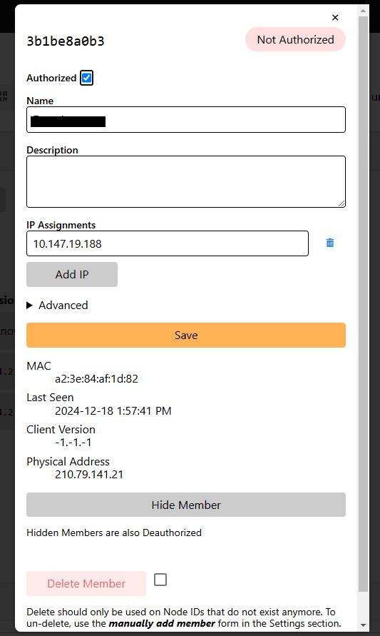 Pada halaman konfigurasi zerotier akan muncul id host baru, centang Authorized untuk mengizinkan perangkat baru yang sudah terkoneksi pada controller zerotier. Berikan nama agar perangkat bisa teringat dengan mudah dan save jika sudah selesai.