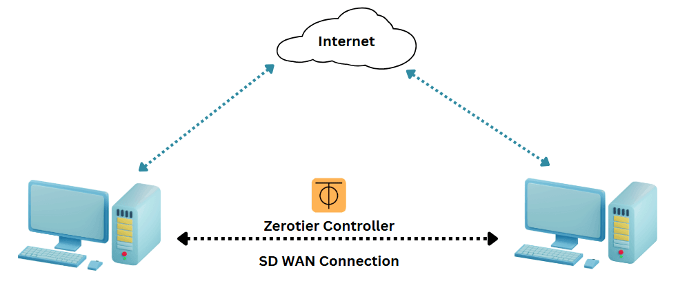 Dua perangkat tersebut sudah terkoneksi ke internet. Controller zerotier akan menghubungkan dua perangkat tersebut secara peer to peer secara langsung dalam sebuah jaringan virtual atau SDWAN.