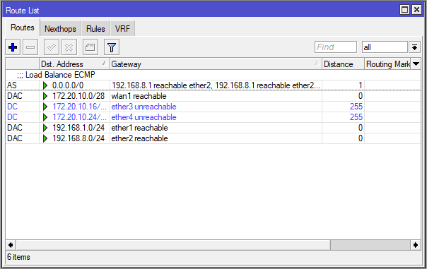 Pada postingan kali ini bandwidth dari ISP1 20Mbps dan ISP2 40Mbps sehingga gateway akan diberikan 1:2. Silahkan sesuaikan dengan bandwidth ISP yang akan digunakan. Berikut adalah tampilan IP Routes setelah ditambakan rule routing ECMP.