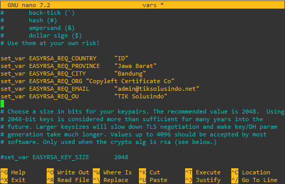 root@debian:~# make-cadir ~/openvpn-ca && cd ~/openvpn-caLakukan konfigurasi pada file vars dengan perintah berikut lalu sesuaikan pada barisan data certificate.