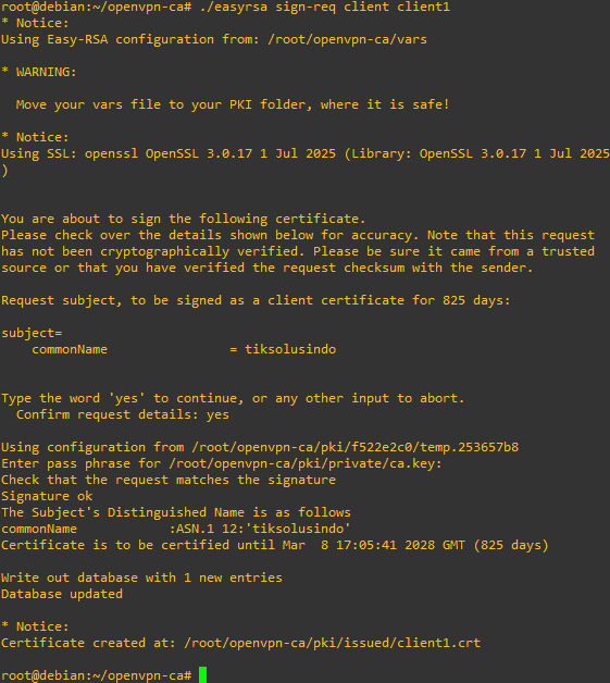 Tanda tangan certificate client dengan perintah berikut.