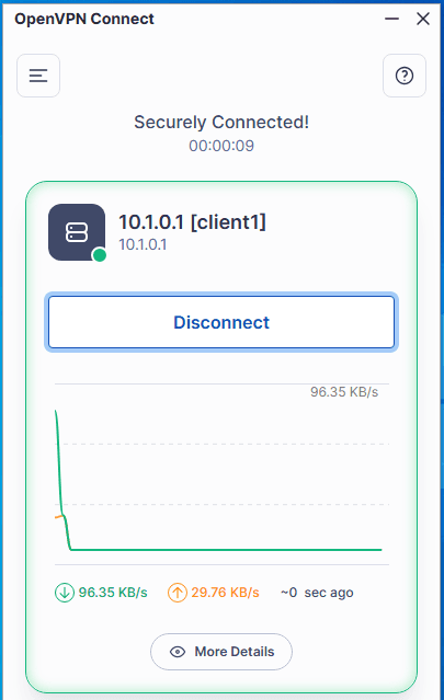 Sampai langkah ini koneksi openvpn sudah berhasil dibuat, jika terkoneksi dengan openvpn maka komputer client akan mendapat akses internet jika tidak maka tidak ada koneksi internet. Hal tersebut terjadi karena pada linux debian dilakukan forwarding paket dan konfigurasi firewall nat yang mengizinkan akses nat untuk subnet 10.8.0.0/24 openvpn ke arah internet.