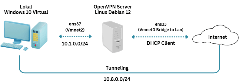 OpenVPN adalah aplikasi open source yang berfungsi untuk membuat sebuah koneksi virtual dari client ke server. OpenVPN menggunakan konfigurasi certificate authority dalam pengimplementasiannya. Hal tersebut berfungsi untuk membuat keamanan koneksi antara client dan server. OpenVPN tersedia untuk platform windows dan linux. Pada postingan kali ini akan dijelaskan konfigurasi openvpn pada linux debian 12. Preconfig sudah dilakukan dengan mengkoneksikan linux debian ke internet dan konfigurasi repository.