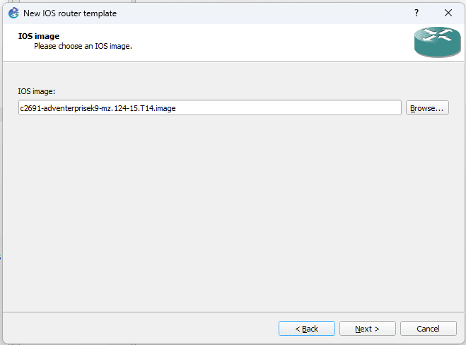 Klik browse kemudian arahkan pada image IOS router. Untuk IOS router tersedia pada link berikut https://gns3.com/marketplace/appliances.