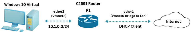 Pada halaman workspace GNS3 buatlah topologi seperti gambar diatas. Cloud berfungsi sebagai bridge untuk interface nic pc asli dan dikoneksikan ke port fa0/0 IOS router. Fa0/1 digunakan untuk menghubungkan ke jaringan lokal pada postingan ini PC Klien menggunakan komputer virtual vmware windows 10. Klik running jika sudah selesai tunggu hingga node – node berwarna hijau.