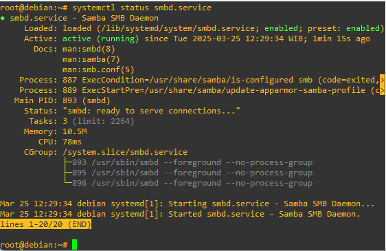 root@debian:~# apt install samba samba-common-binVerikasi status aplikasi samba dengan perintah berikut, pastikan aplikasi berjalan dengan baik.
