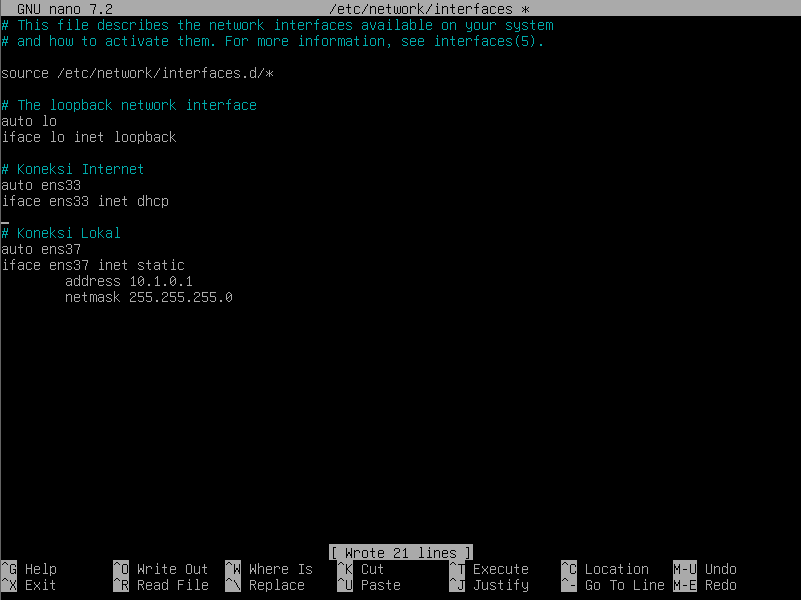 Pada gambar diatas interface ens37 yang mengarah pada komputer lokal belum diberikan alamat ip. Masuk pada file pada file /etc/network/interfaces dan berikan alamat ip seperti berikut.