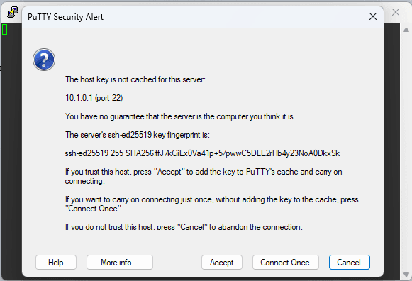 Lakukan pengujian dengan aplikasi putty dan berikan alamat ip linux debian. Jika berhasil maka akan muncul konfirmasi untuk melanjutkan koneksi.