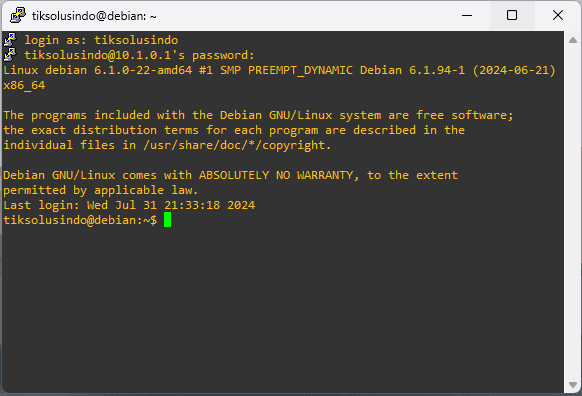 Login dengan menggunakan username dan password general user dan linux sudah dapat diakses dengan ssh client.