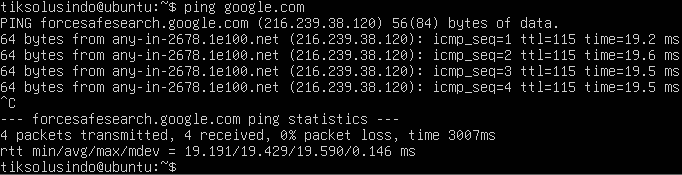 Verfikasi koneksi dengan melakukan ping ke arah domain google.com.