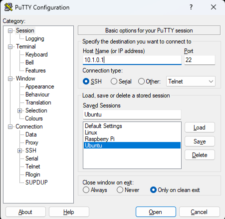 Buka aplikasi putty untuk melakukan remote server dengan memasukan ip address server yaitu 10.1.0.1.