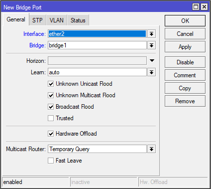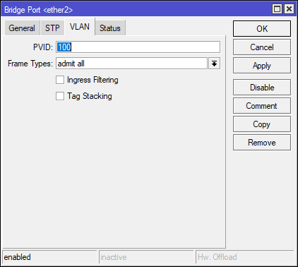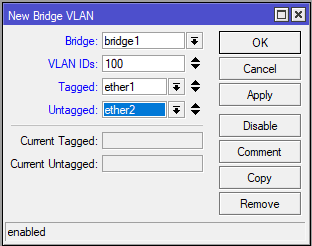 Tambahkan interface ether2 ke dalam bridge1 untuk melewatkan PVID VLAN 100.