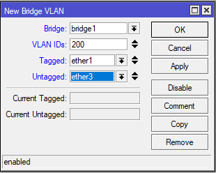 Tambahkan interface ether3 ke dalam interface bridge1 untuk melewatkan PVID VLAN 200.