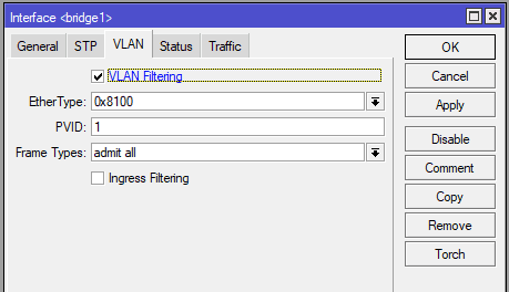 Untuk mengaktifkan konfigurasi VLAN masuk pada menu Bridge lalu klik bridge1 pilih submenu VLAN dan aktifkan VLAN Filtering.
