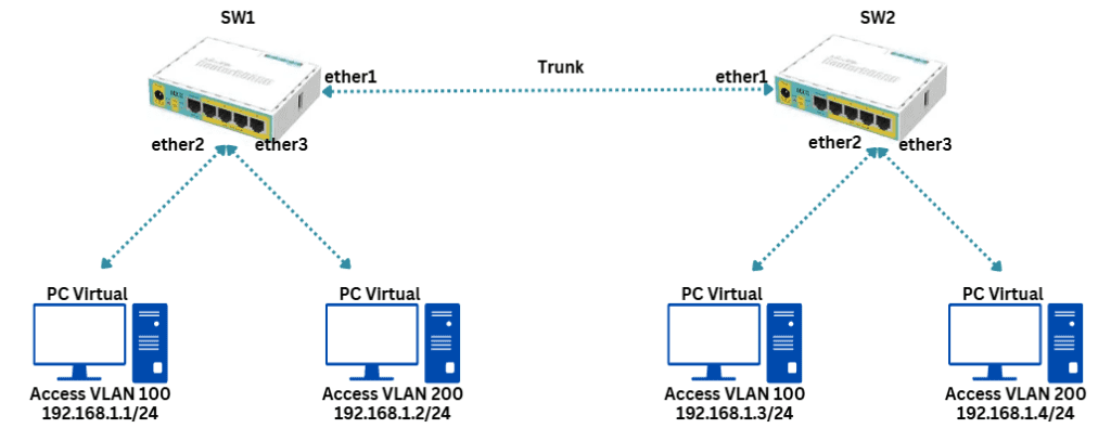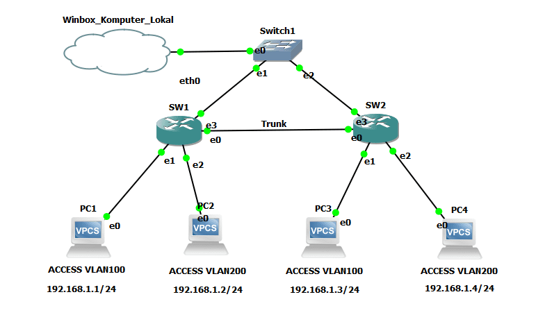 VLAN (Virtual Local Area Network) adalah sekelompok perangkat pada satu LAN atau lebih yang dikonfigurasikan secara logic sehingga dapat berkomunikasi seperti halnya bila perangkat tersebut terhubung ke jalur yang sama, padahal sebenarnya perangkat tersebut berada pada sejumlah segmen LAN yang berbeda. Pada postingan ini akan dijelaskan konfigurasi VLAN Access dan Trunking pada perangkat mikrotik. Sebelumnya sudah dilakukan preconfig import mikrotik chr ke GNS3 yang berada pada postingan berikut Cara Import Mikrotik CHR ke GNS3.