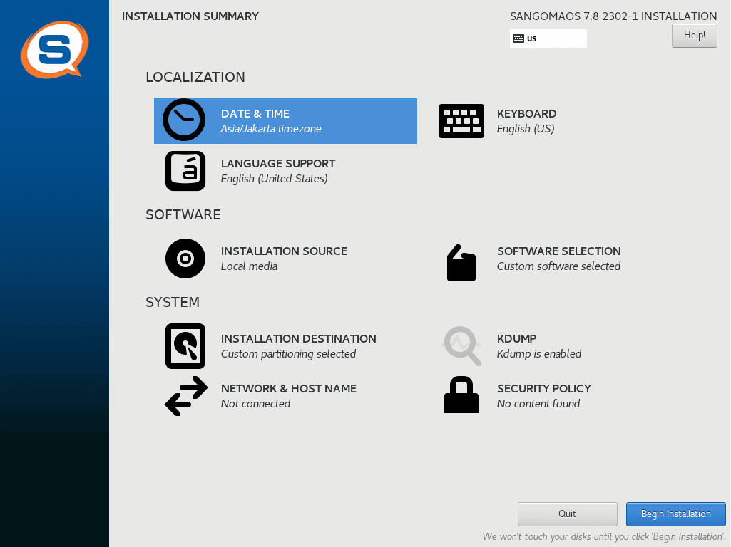 Ubah time zone menjadi Asia/Jakarta klin Begin Installation serta berikan password untuk user root. Tunggu hingga proses instalasi selesai.