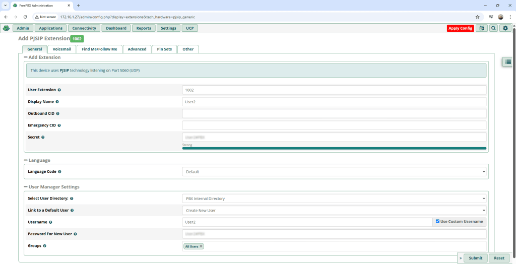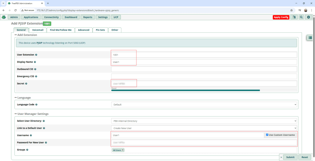 Tekan Submit lalu pilih Apply Config yang berada pada pojok kanan atas. Buat satu user kembali dan ulangi langkah yang sama.