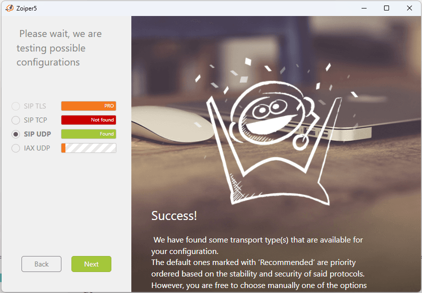 Pilih skip untuk pengaturan proxy kemudian tunggu hingga proses scaning selesai. Pastikan opsi SIP UDP berhasil ditemukan jika masih error cobalah untuk melakukan restart pada VM free pbx.
