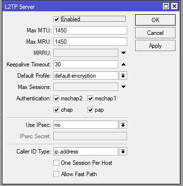 Buka menu PPP kemudian klik L2TP Server berikan centang pada kolom enable untuk mengaktifkan.