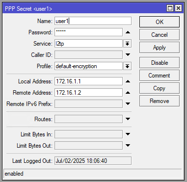 Kesimpulan pada postingan ini adalah L2TP Server berfungsi untuk mebuat sebuah koneksi VPN yang aman untuk suatu jaringan. Konfigurasi ini bisa diimplementasikan pada perangkat mikrotik. Jika masih ada penjelesan yang kurang jelas silahkan bertanya pada kolom komentar dibawah.