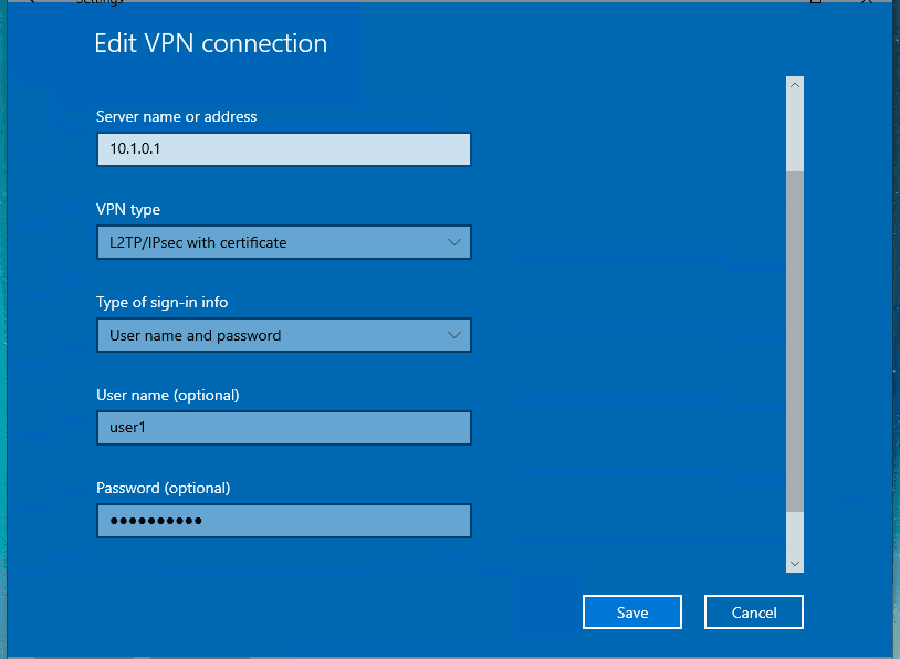 Buka konfigurasi VPN pada windows 10 kemudian pilih jenis L2TP dan ip 10.1.0.1 sesuai dengan network pada topologi dan masukan username password.