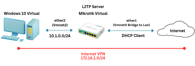 L2TP Server adalah sebuah protokol vpn tunneling yang berfungsi menghubungkan antara dua jaringan melalui suatu jaringan lain secara aman. Protokol ini tersedia pada perangkat router atau server diberbagai macam vendor. Pada router mikrotik tersedia fitur L2TP Server dengan konfigurasi yang cukup mudah. Pada postingan ini akan dijelaskan bagaimana konfigurasi VPN L2TP Server pada mikrotik. Preconfig konfigurasi dasar mikrotik sudah dilakukan sehingga mikrotik tersebut bisa mengkases internet.