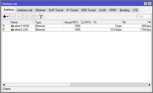 Pada menu interface berikan deskripsi pada setiap interface yang digunakan, pada Router A ether 1 yang mengarah pada WAN atau Internet ether 2 mengarah ke jaringan lokal.
