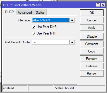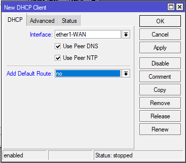 Lakukan konfigurasi DHCP Client pada interface ehter1-WAN agar mendapatkan alokasi alamat ip address dari ISP. Berikan konfigurasi no Add default route karena nantinya akan dilakukan static route secara manual.