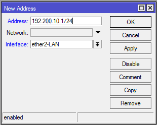 Berikan konfigurasi dengan alamat ip seperti berikut sesuai alamat ip address ether2-LAN.