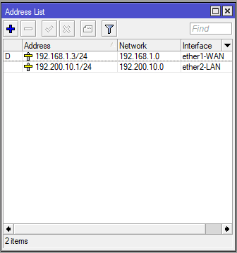Selanjutnya konfigurasi alamat ip address pada interface ether 2 yang mengarah ke jaringan lokal dengan alokasi alamat ip seperti berikut sesuai dengan soal yang diberikan. Menu konfigurasi berada pada IP > Addresses kemudian klik “+” untuk menambahkan ip address baru.