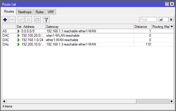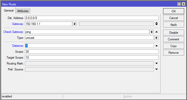 Pada menu IP > Route berikan konfgurasi default route static yang mengarah pada internet seperti pada Router A. Berikut adalah tampilan halaman IP Route pada Router B.