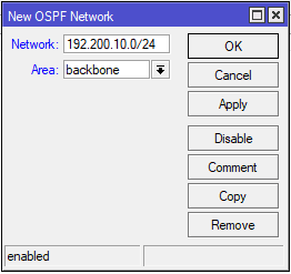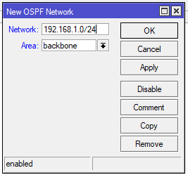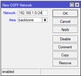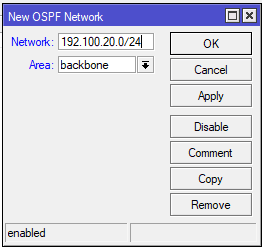 Selain routing static lakukan juga routing dynamic pada pembahasan kali ini routing dynamic yang digunakan adalah OSPF. Masuk pada menu Routing > OSPF > Network dan berikan network address pada setiap interface yang terhubung.