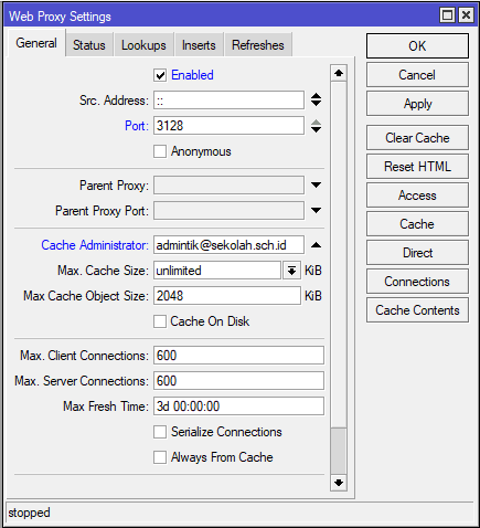Masuk pada menu IP > Web Proxy untuk mengaktifkan dan melakukan konfigurasi akses proxy. Berikan konfigurasi seperti gambar dibawah.