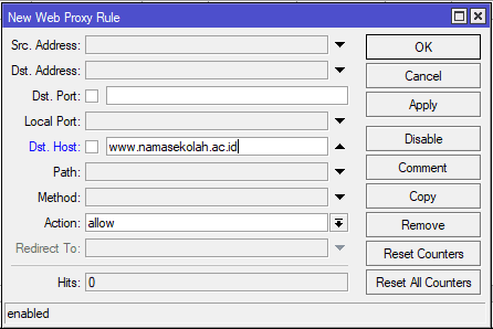 Klik menu Access untuk menambahkan host atau domain yang diberikan akses atau tidak, berikan akses ke halaman domain sekolah dengan megisi kolom Dst Host dengan action Allow.