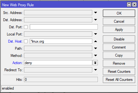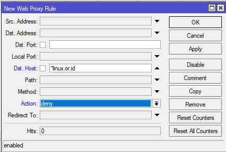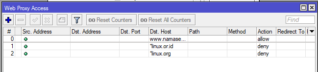 Sebaliknya untuk melakukan blocking pada domain tertentu berikan Action deny. Berikan dua domain untuk dilakukan blocking.