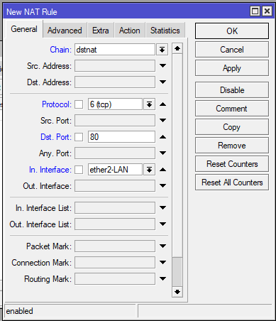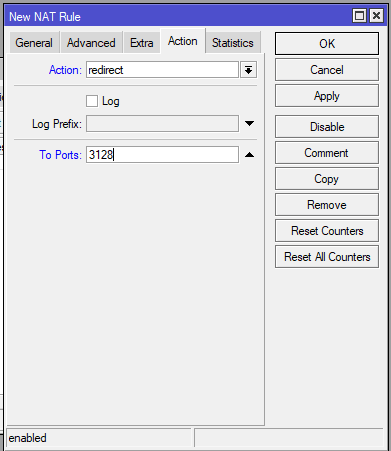 Setelah konfigurasi proxy diaktifkan tambahkan konfigurasi nat agar traffic pada port 80 di redirect terlebih dahulu pada port proxy yaitu 3128. Pada menu IP > Firewall > NAT berikan chain dstnat, dst port 80 in interface ether2-LAN dengan action redirect to port 3128.