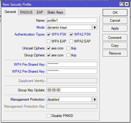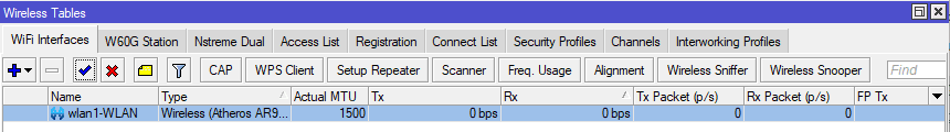 Aktifkan interface wlan pada menu Wireless kemudian masu pada submenu security profile untuk membuat password wlan.