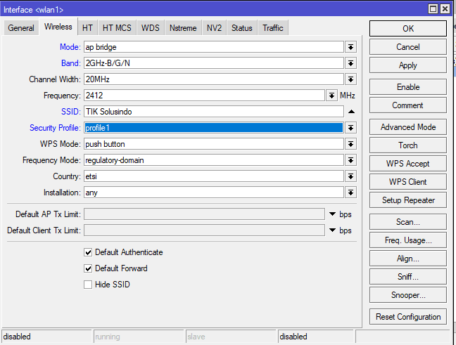 Klik interface wlan kemudian berikan deskripsi pada submenu general lalu masuk pada submenu wireless dan lakukan konfigurasi ap mode seperti pada gambar dibawah. Berikan profile1 pada opsi Security Profile sesuai yang telah dibuat pada langkah sebelumnya.