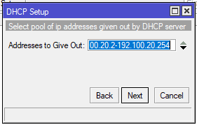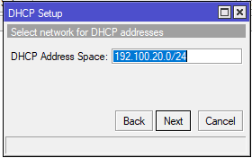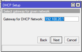 Berikan alokasi subnet sesuai network yang digunakan pada penjelasan kali ini subnet yang digunakan adalah 192.100.20.0/24 dengan gateway 192.100.20.1 dan alokasi alamat untuk klien dimulai dari 192.100.20.2-192.100.20.254.