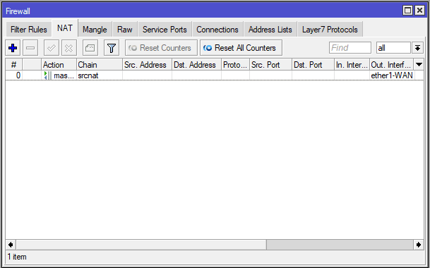 Buat konfgurasi firewall nat dengan action masquerade kearah interface etthe1-WAN. Hal ini berfungsi agar jaringan lokal bisa mengakses internet menggunakan alamat ip address ether1-WAN. Konfigurasi berada pada menu IP > Firewall > NAT.