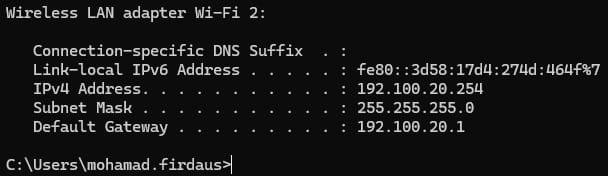 Verifikasi ip address yang didapatkan oleh laptop pada cmd dengan menggunakan perintah ipconfig. Jika ip address wifi sudah seperti gambar dibawah maka konfgurasi DHCP Server Router B sudah berhasil.