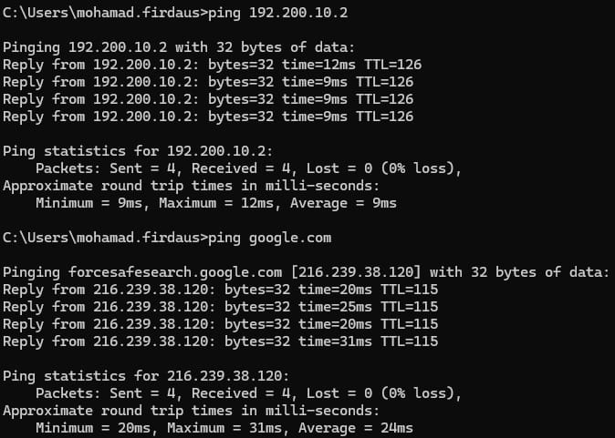 Lakukan tes koneksi pada komputer jaringan lokal Router A dan Laptop Router B serta tes ping ke arah internet dari dua perangkat tersebut. Jika saling mereply seperti pada gambar dibawah maka konfigurasi routing static dan dynamic sudah berhasil dilakukan.